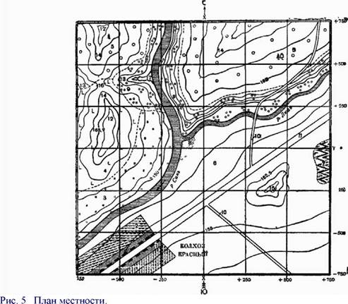 На рис. 5 представлен план, на котором показано шоссе 11, идущее через колхоз «Красный», постройки 1 и огороды 2 колхоза, грунтовые дороги 10, реки, мост на грунтовой дороге через р. Люль, луг 3, вырубленный лес 4, хвойный и смешанный лес 5, пашня 6, болото 7, песок 8, кустарник 9. Неровности местности, или рельеф, выражены на плане горизонталями. На вершине одного из холмов 12 показана точка с абсолютной отметкой 163,2 м. Направление ската холмов показано короткими штрихами, перпендикулярными к горизонталям, называемыми бергштрихами. Бергштрихи поставлены и у горизонталей, изображающих лощины 13. Сочетание этих лощин с двумя противоположными хребтами 14 представляет седловину 16 — форму, напоминающую седло. Правее седловины показан овраг 17. левее болота — котловина 15. Одинаковые по форме выпуклости и вогнутости земной поверхности изображаются горизонталями одинаково. В этом недостаток горизонталей. Для различения таких форм на плане и ставят бергштрихи. По плану можно решать различные задачи: определять расстояния между отдельными пунктами, находить отметки отдельных точек, измерять углы между заданными направлениями, определять крутизну скатов, измерять площади фигур, показанных на плане и т. п. При помощи плана и профиля проектируют сооружения (дороги, каналы, мосты, дорожные трубы и т. д.). Для инженерных целей необходимы планы с изображением на них предметов местности (ситуации) и рельефа. Такие планы называются топографическими. Однако для решения отдельных специальных задач оказываются достаточными планы, на которых указана только ситуация без рельефа. Такие планы называются контурными или ситуационными. Точность решения задач при помощи плана зависит в значительной мере от полноты содержания плана и степени детальности изображения на нем различных предметов и неровностей местности. Подробность изображения различных контуров местности на плане, в свою очередь, зависит от степени уменьшения горизонтальных проекций контуров при перенесении их с натуры на план, т. е. от масштаба плана. Масштаб плана. Численный, линейный и поперечный масштабы. Точность Date: 2015-09-19; view: 994; Нарушение авторских прав |
