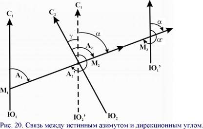 Рис. 19. Углы ориентирования Направление истинного меридиана определяется на данной точке при помощи астрономических наблюдений, а направление магнитного меридиана - при помощи магнитной стрелки, которая устанавливается под действием земного магнетизма в направлении магнитного меридиана. Конец стрелки, обращенный северному полюсу Земли, называют северным, а другой конец - южным. Магнитный меридиан в данной точке земной поверхности, как правило, не совпадает с истинным: угол между ними называется склонением магнитной стрелки. Склонение называют восточным или западным, смотря по тому, отклоняется ли северный конец магнитной стрелки к востоку или к западу от географического меридиана. Для ориентирования линий служат углы ориентирования, называемые азимутами, дирекционными углами и румбами. Азимуты. Азимутом называется горизонтальный угол, отсчитываемый от северного направления меридиана по ходу часовой стрелки до направления данной линии; азимуты могут иметь значения от 0 до 360°. Азимут называется истинным, если он отсчитывается от истинного меридиана, и магнитным, если он отсчитывается от магнитного меридиана. Пусть линия СЮ (рис. 19) — направление меридиана в точке М (истинного или магнитного). 3В - направление, перпендикулярное к меридиану. Тогда направление МВ укажет на восток, а МЗ — на запад. Рассмотрим проекции линий местности М1, М2, МЗ и М4 на горизонтальную плоскость. Горизонтальные углы А1г А2,, Аз и А4 представят азимуты этих линий. Если линия СЮ есть истинный меридиан, то и азимуты этих линий будут истинными азимутами. Если же СЮ - магнитный меридиан, то эти углы - магнитные азимуты. Так как меридианы в разных точках Земли не параллельны между собой, то азимут одной и той же линии в разных ее точках различен. Так, для линии М1М2 (рис. 20) азимут в точке М1 равен Аь в точке М2—А2; азимут А2 отличается от азимута А1 на величину угла у между меридианами этих точек. Этот угол у называется сближением меридианов. Его легко представить, если провести мысленно через одну из двух данных точек направление, параллельное меридиану другой точки. На рис. 20 угол у представлен как угол между меридианом С2Ю2 точки М2 и направлением С Ю1 ЦС1 Юь Как видно из рисунка, А - А = у. Если точки М1 и М2 близки, то можно принять у=0, и тогда А2=А1, а меридианы в соответствующих точках можно рассматривать как параллельные. Азимут данного направления называется прямым, а противоположного - обратным. Для линии М1М2 (рис. 20) А1 и А2—прямые азимуты этой линии в разных ее точках, А2 - обратный азимут той же линии в точке М2. Как видно на рис. 20, а; = а +1800 + у (IV. 1) а; = А2 +1800, (IV.;) т. е. прямой и обратный азимуты одной и той же линии в разных ее точках отличаются между собой на 180°+ у; прямой и обратный азимуты данной линии в одной и той же точке различаются на 180°. Дирекционные углы. Дирекционные углы применяются в геодезии для ориентирования линий относительно осевого меридиана, или линии, ему параллельной. Если на рис. 20 меридиан С1Ю1 точке М1 будем рассматривать как осевой в равноугольной поперечно-цилиндрической проекции, линию С2Ю2 как истинный, меридиан в точке М2, а линию С Ю1, параллельную С1Ю1, как одну из вертикальных линий километровой сетки, то А2 представит истинный азимут, а а - дирекционный угол линии М1М2 в точке М2, т. е. дирекционный угол отсчитывается от северного направления осевог