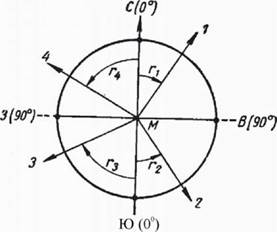 Рис. 21. Прямой и обратный дирекционные углы Румбы. Иногда на практике удобнее определять направление линий острыми углами. В этих случаях пользуются румбами. Румбом, называется острый горизонтальный угол отсчитываемый от ближайшего направления меридиана (северного или южного) до данной линии. Румбы могут иметь значения только в пределах между 0 и 90°. На рис. 22 обозначены румбы четырех линий М1, М2, МЗ и М4, направления которых на рис. 20 были определены азимутами. Чтобы определить румбом направление данной линии относительно меридиана, необходимо, кроме числового значения румба, указать название той четверти, в которой проходит линия. Так, линии М1, М2, МЗ и М4 имеют соответственно румбы СВ: г1, ЮВ: г2, ЮЗ: г3, СЗ: г4. В зависимости от того, отсчитываются ли румбы от магнитного или истинного меридиана, их называют магнитными или истинными. Из сопоставления рис. 19 и 22 видно, что для линий северо-восточного направления азимут А1 по величине равен румбу г1. Для линий юго-восточного направления азимут и румб в сумме составляют 180°. Если линия проходит в юго-западной четверти, то ее азимут больше румба на 180°, и, наконец, для линий северо-западного направления азимут и румб составляют в сумме 360°. Эти соотношения позволяют переводить азимуты в румбы и обратно. Например, если азимут линии А =215°, то ее румб равен А-180°=2150-1800=350 и имеет название ЮЗ. Если азимут линии А =100°, то ее румб равен 180°-А= 180°-100° =80° и имеет название ЮВ и т. д. Если на рис. 19 меридиан СЮ рассматривать как осевой или как линию, параллельную осевому меридиану данной зоны, то углы Аь Л2, А3 и А4 представят дирекционные углы линий М1, М2, МЗ и М4 и должны быть обозначены соответственно аь а2, а3 и а4. При этом условии на рис. 22 мы найдем соответствующие им румбы, которые назовем осевыми.