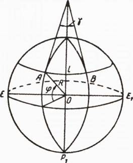 При работе с картой, составленной в равноугольной поперечно-цилиндрической проекции, направления линий по карте определяют дирекционными углами. Для перехода от дирекционных углов к истинным азимутам по формулам, данным в § 16, надо знать сближение меридианов. Приближенно сближение меридианов можно найти так. Примем общую фигуру Земли за шар, радиус которого К=6371 км (рис. 25). На какой-нибудь параллели с широтой ф возьмем две точки А и В, линейное расстояние между которыми пусть будет 1 км. В точках А и В вообразим касательные к меридианам, проходящим через эти точки. Эти касательные называются полуденными линиями. Тогда угол между касательными представит сближение меридианов точек А и В. Для точек А и В, расположенных в пределах одной какой-нибудь зоны, угол у настолько мал, что рис. 25 расстояние I можно рассматривать как дугу радиуса АТ. Тогда угол у, выраженный в радианах, будет I 7 =-----, АТ Но К АТ = К1§(900 -ф) = Ка§ф = ■ *8Ф следовательно, I 7 = — К Так как в одном радиане 3438', то сближение меридианов, выраженное в минутах, будет