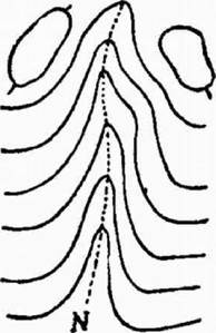 Пусть горизонтали имеют вид замкнутых кривых, как это показано на рис. 31. Нетрудно убедиться, что представленные на плане горизонтали изображают холм. В самом деле, если из точки М перемещаться по любому направлению, то будем постепенно понижаться, пересекая последовательно горизонтали 20, 18, 16, 14 и т. д. Точка М - вершина холма. Замкнутые горизонтали с отметками, возрастающими в стороны от М (рис. 32), указывают на то, что поверхность земли образует в этом месте впадину, т. е. форму, противоположную холму. Допустим теперь, что горизонтали на плане имеют вид разомкнутых кривых, обращенных выпуклостью в одну сторону (рис. 33). Рассматривая отметки горизонталей, замечаем, что по направлению от точки М к N местность понижается; в поперечном направлении она сначала повышается, достигает наибольшей Легко определить, что на рис. 34 изображена форма, противоположная хребту, т. е. лощина. Линия МЫ является осью этой лощины. Сопоставляя рис. 33 и 34, видим, что горизонтали, изображающие хребет, обращены выпуклостью вниз по склону, а лощину - выпуклостью вверх по склону. м