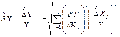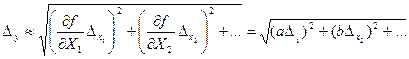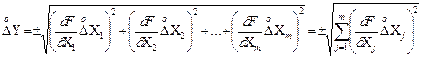 Тут df/dXj - частинна похідна від Y по j -му аргументу; В реальних умовах у випадку додавання похибок можлива їх часткова взаємна компенсація, тому така формула дає дещо завищені результати. Кращі результати можна отримати середньоквадратичним сумуванням похибок: