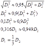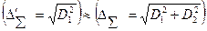 У формулах (1.62), (1.65) величини k, a, b,... – це будь-які цілі або дробові, додатні або від'ємні числа. Оскільки в результатах прямих вимірювань аргументів було використано надійні межі сумарних похибок, то похибки результатів опосередкованих вимірювань також відображують надійні границі сумарних похибок цих результатів. Запис результату опосередкованого вимірювання має вигляд: Y = Ay ± ∆Aу. (1.67) Критерій незначних частинних похибок. Обчислюючи похибку опосередкованого вимірювання, доводиться сумувати частинні похибки, різні за значенням. Обчислення можна спростити, якщо знехтувати тими з них, значення яких неістотні порівняно з іншими. Припустимо, треба підсумувати дві частинні похибки D1 та D2, причому D1<<D2. В загальному випадку сумарна похибка