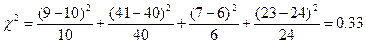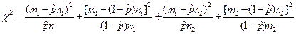 де у знаменниках записано оцінки відповідних дисперсій. Беручи до уваги, що між чотирма теоретичними частотами існує три незалежні співвідношення, у розподілі χ2 необхідно враховувати тільки один ступінь свободи. Якщо нульова гіпотеза, відповідно до якої обидві сукупності є вибірками з однієї генеральної сукупності, правильна, то розбіжність між теоретичними та дослідними частотами можна віднести тільки на рахунок випадкового відбору. Тому, визначивши для рівня значущості α значення χ2, приймемо рішення про відхилення гіпотези H0, якщо Приклад. Проводились випробування нового методу лікування. Одна група (експериментальна) — з 50 осіб (n1 = 50) лікувалася за новим методом, а друга («традиційна»), яка складалася з 30 осіб (n2 = 30), — за традиційним методом. Після завершення лікування у першій групі залишилося 9 хворих (m1=9), а в другій — 7 (m2=7). Необхідно перевірити суттєвість ефективності нового методу. Обчислимо оцінку теоретичної частоти хворих після лікування: