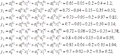 У протилежному разі цей коефіцієнт необхідно визнати незначним. У розглянутому прикладі коефіцієнт d4, b6 і b7 мають числове значення менше 10-2, тому вважаємо їх незначними. Таким чином, функція відклику має вигляд y(v,h,q)=0.74125+0.06625x1-0.17875x2-0.37625x3-0.02625x1x3. Розрахуємо дисперсію адекватності: