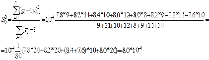 За таблицею розподілу Фішера виберемо Fm, задавши a=0.05, fi1=10 i fi2 =10 При цьому FT=2.98. Оскільки F<F m, то немає підстав для відхилення гіпотези H 0 про те, що дисперсії однорідні. Обчислимо тепер дисперсію відтворюваності експерименту