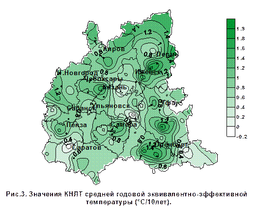 Значения КНЛТ приведенной температуры на территории ПФО меняются от -0,16 до 2,82 оС/10лет (рис.5).