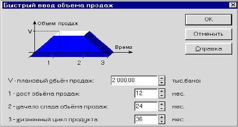 года выпуска. В последний год проекта (т.е. начиная с 25-го месяца) пред- полагается спад продаж продукции. План сбыта данного продукта можно описать с помощью четырех параметров в диалоге «Быстрый ввод объѐма продаж», открывая его, нажатием на кнопку «Быстрый ввод…». Вводим: