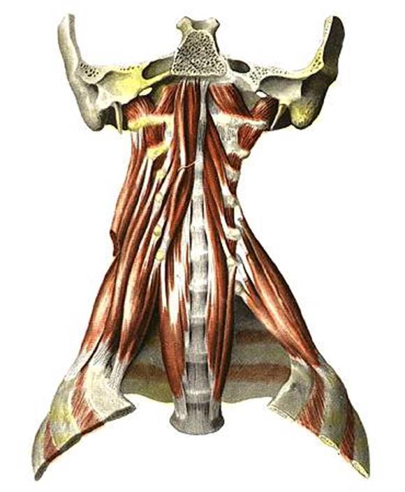 | 1-передняя прямая мышца головы; 2-латеральная прямая мышца головы; 3-межпоперечные мышцы спины; 4-длинная мышца головы; | 5-передняя лестничная мышца; 6-средняя лестничная мышца; 7-длинная мышца шеи; 8-задняя лестничная мышца | ||||||||||||||||