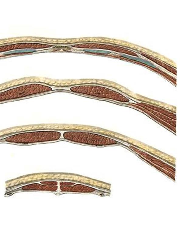Схема образования влагалища прямой мышцы живота. Горизонтальный разрез передней стенки живота.