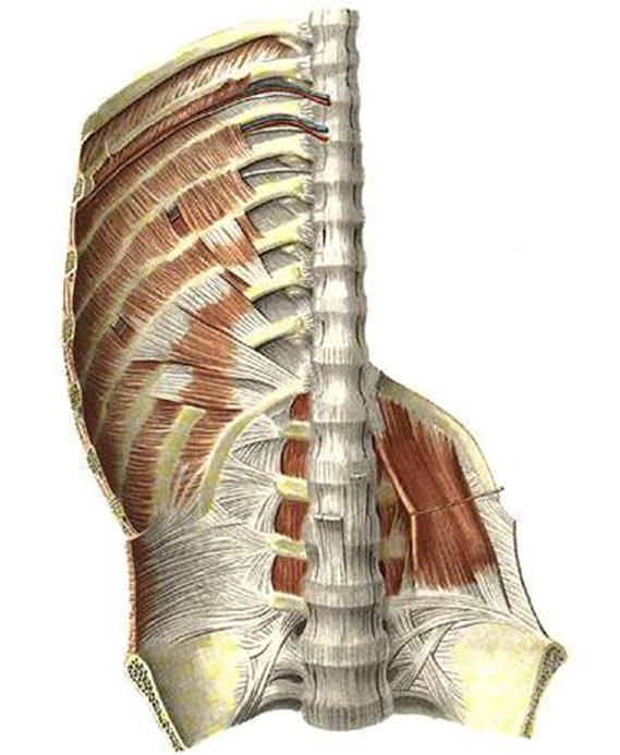 | 1- средняя лестничная мышца 2-передняя лестничная мышца 3-подлючичная мышца 4-передняя зубчатая мышца 5-внутренние межреберные мышцы 6-наружные межреберные мышцы | 7-внутренняя косая мышца живота 8-ременная мышца; 9-мышца поднимающая лапатку; 10-подлопаточная мышца 11-большая круглая мышца 12-широчайшая мышца спины |