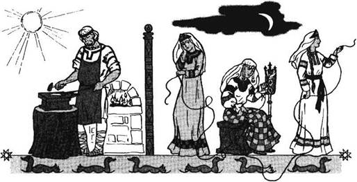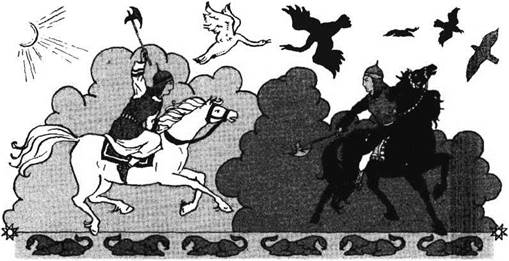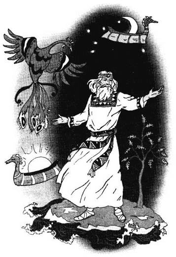 Глава 1 КАК РОДИЛСЯ наш удивительный МИР Знаете ли вы, дорогие девочки и мальчики, что когда-то давным-давно, в древние времена, в стародавние, когда время ещё было безвременьем, а весь наш белый свет умещался в крохотном зародыше, существовал в этом безначальном начале великий бог Род? Не знаете? А наши предки-славяне, жившие тысячу и более лет назад, были в этом твёрдо уверены. Сначала Род находился внутри мирового яйца — дремал себе подрёмывал под его золотой скорлупой, а вокруг ничегошеньки не было. Всякая быль ещё была небылью, а любая небыль — былью. Не существовало ни света ни тьмы, ни ночи ни дня, ни воды ни земли. Лишь пылинки, песчинки да семена будущей жизни носились себе в пустоте. А будущий наш родоначальник, будущий родник нашей жизни, Причина всех Причин, бог Род всё спал и спал в волшебном яйце и видел сны — про мир чудесный, в котором всё обустроено и где всему место есть. Ветрам буйным и зорям ясным, светлому месяцу и ярким звёздочкам, лесам дремучим и высоким горам, быстрым рекам и болотам топким, птицам, рыбам, змеям, зверям, цветам и травам. И богам и людям. И Правде и Кривде. Белому свету и Чёрному мраку. Жизни и Смерти. Оттого и звался этот бог Родом, что мог рождать всё сущее, оттого и живут до сих пор в нашем языке эти слова — сородичи, природа, родина. Долго росло волшебное яйцо в пустоте и набирало силу, пока однажды не решил Род, что пришло его время: родилась Любовь в его душе, и он полюбил всё, что выдумал. Сила любви — великая сила, с её помощью в назначенный судьбой день и час расколол Род золотое яйцо на части, и из него вышли воды небесные и земные, твердь земная и небесная, возникли Свет и Тьма, солнце выплыло из лица бога Рода в золотой ладье, а звёзды и месяц — в ладье серебряной. Всему сущему стал Род и отцом и матерью. Так весь поднебесный мир вышел из бога Рода. Радугой разрезав пуповину, отделил Род земные воды от вод небесных каменной твердью, Свет отделил от Мрака, а Правду от Кривды. Из дыхания Рода вышла Лада — богиня любви, обратилась в птицу Сва, птицу Славу чудесную, и полетела по-над землёй. Потому что небеса и вся поднебесная рождены были Родом для любви. И вот родил Род небесное царство Правь, потом — царство срединное Явь, а следом — тёмное царство Навь. Из мирового неведомого пространства упало семечко, и стал расти огромный Дуб — Мировое Древо, высокое и могучее. Корнями должно было уходить оно в царство глубинное, призрачное, туда, где место лишь для мёртвых и для тёмных сил; ствол его пойдёт поперёк царства Явного, где поселятся скоро живые и будут жить, пока не истечёт их срок; а верхушка и вовсе доберётся до Правильного царства, до страны, в которой вот-вот появятся могучие боги и станут править миром. Одно плохо: перемешано всё в мире, и некому наблюдать за порядком, всё подмечать, за всем, что родилось, присматривать и доделывать то, что начато. Тогда кликнул Род птицу Сва и создал себе родича, творца и помощника, — Сварога могучего, вдохнул в него свой всесильный дух и дал ему не одну голову, а целых четыре, чтобы мог он на все четыре стороны света оборачиваться. И поднял Сварог могучими руками над морем небо, названное в честь него Сваргой, и пошёл ходить по нему, из поднебесья мир оглядывая. А потом дальше давай то да сё сварганивать! Ведь имя тому богу было Сварог. Вам, мальчики и девочки, должно быть, знаком