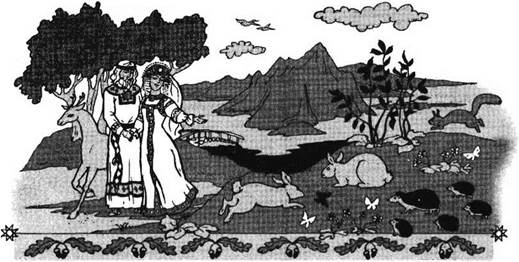Вселенную, чтобы самому повсюду хозяйничать, Явь и Правь себе забрать. Тут надо сказать вам, дорогие мальчики и девочки, что когда Чернобог зародился в своём подземном царстве, то с виду он походил на злобного старика с седыми усами. Но когда решил вылезти на белый свет и пойти завоёвывать Синюю Сваргу, то превратился в настоящего Змея, огромного-преогромного, сильного и страшного. Вот вылез этот Чёрный Змей на белый свет, посмотрел на мир и так и этак, и мир ему совсем не понравился: слишком много света и жизни. "Ну, ничего! Я тут всё устрою по-своему, — решил Чёрный Змей. — А пока поползу к Рипейским белым горам, посмотрю, что там Сварог поделывает!" А Сварог уже заподозрил неладное: дева Правда ему подсказала, не умеющая лукавить. Выковал себе Сварог огромный молот и стукнул тем молотом по бел-горюч камню Алатырю, чтоб родились ему в мире помощники — светлые силы и небесное воинство. И вот, дорогие девочки и мальчики, разлетелись от удара искры во все стороны, и из тех искр стали рождаться боги — могучие да великие. Светлый Дажьбог, податель всех благ, родился от искры, упавшей на небо. Стал он первым борцом с навьими силами, ярким солнечным богом, охранителем белого света, богом света божьего. А по веленью Рода всесильного родился Дажьбогу помощник — вышел из солнца круглого бог Хоре, жёлтый бог диска солнечного, яркое Дневное Око, круглолицый и круглоглазый. Хороший бог. От другой искры, упавшей на землю, загорелся огонь божественный, и в его очищающем пламени родился бог огня Семаргл-Сварожич на коне златогривом серебряной масти. Дымный столб от пожара стал его знаменем — выжигать он готов до тла силу чёрную. Где проедет семисильный бог, там выжженный след останется. А из третьей искры, раздутой Родом прямо в воздухе, родился Стрый-Стрибог — Семарглу в помощь. Будет он повелевать всеми ветрами да ураганами. Сможет раздуть из искры любое пламя. Если объединятся Стрый с Семарглом, кто сумеет остановить силу этакую? А ещё, дорогие мальчики и девочки, родились из тех искр небесные воины, смелые ратники, защитники жизни. Вот только и Чернобог — Чёрный Змей был не лыком шит. Когда кони ночные, чёрные сменили дневную конницу, когда Хоре унёс солнце за море, Чёрный Змей подполз к камню Алатырю и ударил по нему железным хвостом. Ох и больно стало змеище! Хвост отбил он себе, окаянный. И завыл, зашипел от обиды. Но и зла понаделал немало: от тех искорок, что посыпались с камня, родилась вся нечисть земная и подземная, и вся чёрная рать змеиная, огнедышащая и многоголовая. А ещё птица чёрный гоголь пришла от камня к Чёрному Змею. Стала она нести яйца, только оказались яйца те сплошь железные. Потому что полны они были тёмной силушкой — силой Нави. А что же Дажьбог могучий? Неужели же ничего не заметил? Нет, дорогие мальчики и девочки, не волнуйтесь и будьте спокойны! Когда Хоре за тучку прячется или вовсе уходит с неба на ночь, Дажьбог по-прежне- му охраняет мир от тёмных сил, постоянно несёт земле свет и тепло. Потому-то и заметил он нечисть народившуюся. Кликнул братца Семаргла огненного, наказал, чтоб летел тот к Сварогу в Синюю Сваргу и донёс весть о том, что великая битва близится. С силами навьими, силами тёмными. Обернулся Семаргл крылатым псом и рыжим пламенем взметнулся под облака. Прилетел в Сварогову кузницу, рассказал обо всём, что узнал Дажьбог. — 
