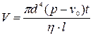 Установлено, что при медленном течении газа по трубке небольшого сечения под действием постоянной внешней разности давлений он движется слоями. Скорость слоя прилегающего к стенкам капилляра в результате прилипания молекул близка к нулю. На оси капилляра скорость газа максимальна. Вследствие хаотического (теплового) движения молекул между движущимися друг относительно друга слоями газа происходит постоянный обмен молекулами. Это приводит к переносу от слоя к слою определенного количества движения от центрального слоя газа, где скорость наибольшая, к слоям, движущимся с меньшей скоростью. В результате чего медленные слои ускоряются, а более быстрые замедляются. Такое взаимодействие слоев газа (жидкости) препятствующее перемещению одного слоя относительно другого называется вязкостью (внутренним трением). Количественно вязкость определяется величиной касательной силы, которая должна быть приложена к площади сдвигаемого слоя, Чтобы поддерживать в этом слое ламинарное течение. Ламинарным течением называется движение газа (жидкости) движущегося параллельными слоями с градиентом скорости, перпендикулярным направлению движения молекул. Вязкость газа не зависит от его плотности (давления), т.к. при сжатии газа общее количество молекул, переходящих из слоя в слой, увеличивается, но зато каждая молекула менее глубоко проникает в соседний слой и переносит меньшее количество движения. Для очень разряженных газов понятие вязкости теряет смысл. Французским ученым Ж.Л.М. Пуазейлем был установлен закон течения жидкости в тонкой цилиндрической трубке, названный законом Пуазейля: объем V жидкости, протекающий через поперечное сечение трубки, прямо пропорционален разности давлений p и p0 на концах капилляра, четвертой степени диаметра d трубки, времени протекания t и обратно пропорционален длине трубки и коэффициенту вязкости: