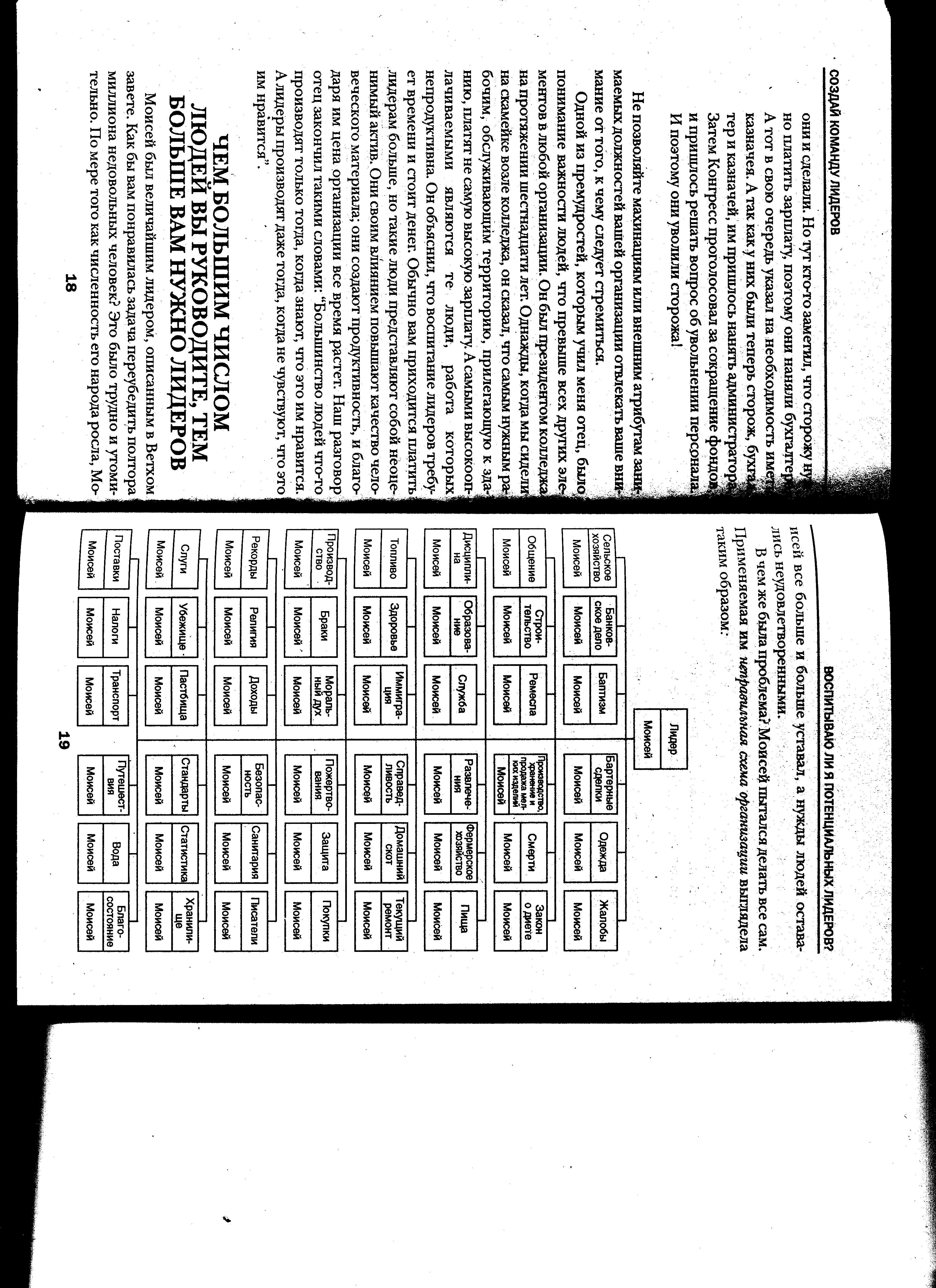 они и сделали. Но тут кто-то заметил, что сторожу нужно платить зарплату, поэтому они наняли бухгалтера, А тот в свою очередь указал на необходимость иметь казначея. А так как у них были теперь сторож, бухгалтер и казначей, им пришлось нанять администратора. Затем Конгресс проголосовал за сокращение фондов, И пришлось решать вопрос об увольнении персонала. И поэтому они уволили сторожа! Не позволяйте махинациям или внешним атрибутам занимаемых должностей вашей организации отвлекать ваше внимание от того, к чему следует стремиться. Одной из премудростей, которым учил меня отец, было понимание важности людей, что превыше всех других элементов в любой организации. Он был президентом колледжа на протяжении шестнадцати лет. Однажды, когда мы сидели; на скамейке возле колледжа, он сказал, что самым нужным рабочим, обслуживающим территорию, прилегающую к зда- нию, платят не самую высокую зарплату. А самыми высокооплачиваемыми являются те люди, работа которых непродуктивна. Он объяснил, что воспитание лидеров требует времени и стоит Денег. Обычно вам приходится платить лидерам больше, но такие люди представляют собой неоценимый актив. Они своим влиянием повышают качество человеческого материала; они создают продуктивность, и благодаря им цена организации все время растет. Наш разговор отец закончил такими словами: "Большинство людей что-то производят только тогда, когда знают, что это им нравится. А лидеры производят даже тогда, когда не чувствуют, что это им нравится". ЧЕМ БОЛЬШИМ ЧИСЛОМ ЛЮДЕЙ ВЫ РУКОВОДИТЕ, ТЕМ БОЛЬШЕ ВАМ НУЖНО ЛИДЕРОВ Моисей был величайшим лидером, описанным в Ветхом завете. Как бы вам понравилась задача переубедить полтора миллиона недовольных человек? Это было трудно и утоми- тельно. По мере того как численность его народа росла, Мо- ВОСПИТЫВАЮ ЛИ Я ПОТЕНЦИАЛЬНЫХ ЛИДЕРОВ? и сей все больше и больше уставал, а нужды людей оставались неудовлетворенными. В чем же была проблема? Моисей пытался делать все сам. Применяемая им неправильная схема организации выглядела таким образом: