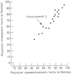 Корреляцией называется такая связь между переменными, когда по изменениям одной из этих переменных можно предсказывать изменения другой. В литературе по индустриально-организационной психологии распространенным примером такой связи является соотношение между возрастом и выраженной удовлетворенностью работой. За годы исследований во многих работах была обнаружена тенденция к положительной корреляции между этими переменными; это означает, что возрастание одной из них происходит вместе с возрастанием другой. С увеличением возраста в целом увеличивается и выраженная удовлетворенность работой. С другой стороны, между удовлетворенностью работой и отсутствием на работе часто обнаруживают отрицательную корреляцию; это значит, что с возрастанием одной из этих переменных другая убывает. С увеличением выраженной удовлетворенности работой уровень отсутствия на работе обычно падает. Разработаны различные процедуры, с помощью которых можно определить, существует ли между двумя переменными, такими как возраст и удовлетворенность работой, корреляционная связь, а если существует, то положительная или отрицательная. Все эти процедуры основаны на одной и той же методике. Производится измерение обеих переменных у каждого испытуемого, и результаты измерений обрабатываются: помощью определенной вычислительной процедуры. Эта процедура позволяет получить коэффициент корреляции r, который уже упоминался выше. В некоторых исследованиях одно из двух измерений, которые при корреляционном анализе проводят у каждого испытуемого, фактически является группой измерений. Индустриально-организационного психолога может, например, заинтересовать связь между результатами пяти отборочных тестов при приеме на работу и показателями учебы по программе профессиональной подготовки. Для исследования этой связи он может использовать процедуру множественной корреляции. Первое измерение — это измерение показателей подготовки каждого испытуемого. Второе измерение — это комбинированный результат тестирования (одно число), который математически выводится из результатов пяти различных отборочных тестов. Когда коэффициент корреляции для этих двух переменных рассчитан, результат обозначают через R (читается как «множественный R»), чтобы было ясно, что речь идет о большем числе переменных, чем обычные две. Все коэффициенты корреляции, независимо от метода их расчета, лежат в диапазоне от -1,00 до +1,00. (В дальнейшем мы будем опускать знак «плюс» для положительных коэффициентов корреляции.) Значение коэффициента корреляции указывает на силу связи между переменными; чем оно ближе к 1,00 со знаком «плюс» или «минус», тем сильнее эта связь. Коэффициент корреляции рассчитывается математически, но часто его представляют графически, в виде так называемого точечного графика. Вводится система координат с двумя осями, вдоль каждой из которых откладываются значения одной из переменных, и строятся точки, соответствующие результатам каждого испытуемого. На рис. 2.3 показан точечный график, отражающий относительные позиции 18 испытуемых по результатам грамматического теста и словарного теста. Один испытуемый (Испытуемый 5) получил по 60 баллов за оба теста. Большинство остальных испытуемых получили разные результаты за разные тесты, но явно существует силь