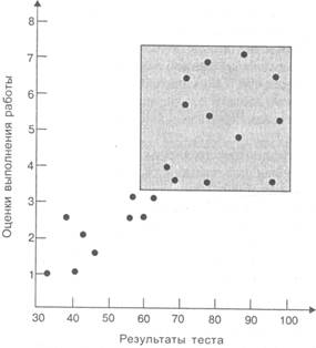 График, приведенный на рисунке 3.4, иллюстрирует проблему, возникающую при получении выводов из исследования, которое проводится с целью доказательства валидности по критерию при ограниченном диапазоне результатов теста. На графике показана связь между результатами отборочного теста (предсказывающая переменная) и оценками выполнения работы за шесть месяцев (критерий) для всего диапазона результатов теста. Коэффициент корреляции r между этими двумя переменными равен примерно 0,40.