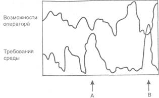 В течение многих лет правительственные органы государства и штатов (а также и все профсоюзы) возлагали ответственность за здоровье и безопасность работников главным образом на организацию-работодателя. Такая политика привела к значительному прогрессу в создании более безопасных и здоровых условий для всех работников, но она имела и свои недостатки. Важным компонентом безопасности на рабочем месте являются также индивидуальные характеристики и поведение. Проводящиеся много лет исследования показывают, что особенно значимы здесь способности, навыки и опыт работников (Fell, 1976). На рис. 9.4 проиллюстрирован один из возможных взглядов на то, как взаимодействие факторов производственной среды и индивидуальных возможностей приводит к несчастным случаям. Меняющиеся требования производственной среды показаны нижней волнистой линией; верхняя линия отражает возможности работника, относящиеся к этим требованиям. Несчастные случаи происходят тогда, когда производственная среда (которая включает инструменты, машины, шум и коллег по работе) требует от работника больше, чем он способен дать в настоящий момент (Oborne, 1982). К примеру, обстановка требует от работника высокого уровня координационных навыков, чтобы он мог обращаться с органами управления и направлять материал в промышленной швейной машине согласно установленному образцу. Если человек, работающий на швейной машине, обладает достаточным опытом, он способен выполнять требования данной рабочей обстановки, хотя рассеянное внимание (неполное использование навыков) приведет к сближению линии требований и линии способностей в точке А. В точке Б произойдет несчастный случай. В данном примере оператор, возможно, подставил палец под механическую иглу.