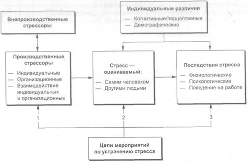 Стресс — это реакция на события и условия, называемые стрессорами, которая может привести к самым разным негативным физическим, психологическим и поведенческим последствиям. Как показано в модели связанного с работой стресса на рис. 9.5 (Ivancevich, Matteson, Freedman & Phillips, 1990), внепроизводственные стрессоры могут добавляться к производственным или взаимодействовать с ними. Индивидуальные различия влияют как на восприятие (оценку) стресса, так и на реакции на него (последствия). В 1990-е гг. стресс на работе стал одной из наиболее актуальных производственных проблем, связанных со здоровьем. По мере возрастания серьезности этой проблемы основой задачей индустриально-организационных психологов становится создание «здоровых» рабочих мест (Cooper & Cartwright, 1994). Возможные варианты решения того, как устранить негативные последствия связанного с работой стресса, показаны пронумерованными стрелками на рис. 9.5.