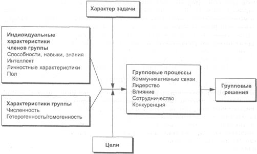 «Две головы лучше, чем одна» — старинная поговорка, отражающая распространенное мнение, что два человека (или более) сумеют принять лучшее — более правильное, более эффективное, более конструктивное — решение, чем один. В основе использования групп в организациях лежит один и тот же принцип. Когда над задачей работает больше людей, принимая решение, можно использовать больший объем информации и больший человеческий опыт. Даже если какой-то один человек знает намного больше о конкретном предмете, ограниченные, но уникальные знания других могут способствовать заполнению тех или иных серьезных пробелов. Кроме того, различные позиции, с которых члены группы подходят к ситуации, должны стимулировать мыслительный процесс и способствовать появлению большего числа идей по обсуждаемым вопросам. Предположение, что, исходя из всех вышеназванных причин, группы должны принимать лучшие решения, чем отдельные люди, тщательно исследовалось в течение многих лет. Результаты этих более ранних исследований носят устойчивый характер и также хорошо согласуются с отличающимися большей сложностью современными экспериментальными методами и анализом (например, Cooke & Kernaghan, 1987). Наиболее важный вывод, касающийся разницы между индивидуальным и групповым принятием решений, заключается в том, что групповые решения отличаются от решений, принимаемых теми же людьми, когда они действуют в одиночку (например. Michaelsen, Watson & Black, 1989; Sniezek & Henry, 1990). Однако примет ли группа лучшее решение, чем то, которое могли бы принять ее индивидуальные члены в одиночку, зависит от ряда факторов. Этими факторами, связи между которыми показаны на рис. 13.3, являются: характер задачи, состав группы (характеристики индивидуальных членов плюс характеристики группы в целом), групповые цели и групповые процессы.