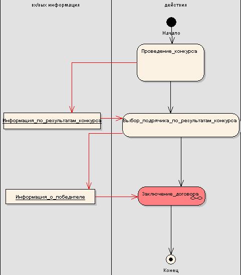 Содержание бизнес процесса - это более детальное представление действий, а также содержание входных и выходных объектов, используемых в деятельности. В диаграмме деятельности выявляется автоматизированный бизнес процесс: «Заключение договора».