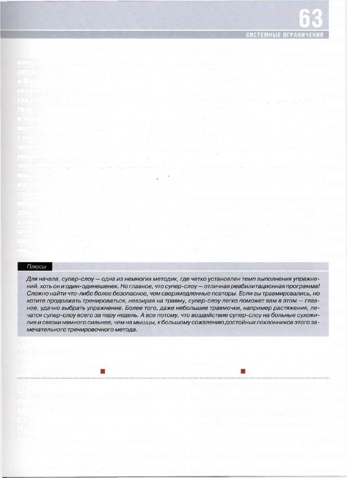 • А с гибкостью? Если подходы супер-слоу насамом деле выполняются в частичной амплиту де, такой тренинг должен вызывать укорочение соединительной ткани работающих суставов. Этот неприятный факт угрожает вам заметным ухудшением гибкости. Поскольку гибкость и так неумолимо снижается даже у тех, кто всю жизнь ведет активный образ жизни, подобный трени ровочный эффект вряд ли кому-либо будет ин тересен.