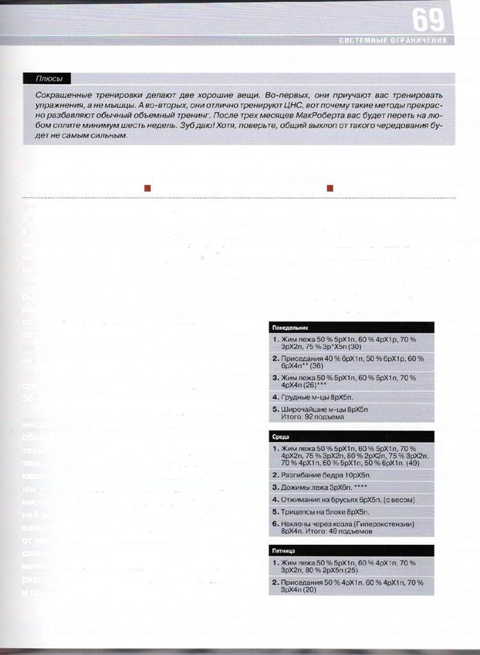 0•Ригидность. Сокращенные программывследствие своей краткости и прямолиней ной конкретности очень жестки сами по себе. Если вам сказано: «нужно делать только ста новую тягу, жим лежа и приседания», вы уже не можете делать становую тягу на одной но ге или рывковую тягу, жим гантелей на на клонной скамье и фронтальные приседания. Такие действия будут считаться отходом от «истиной» системы. К тому же силовые пока затели, которые ставятся во главу угла всей методики, соотносятся только с используе мыми в тренировочных программах упражне ниях. 0• Травмоопасность. Приседания до параллели, рекомендуемые МакРобертом, со вре менем могут привести вас к травме коленных суставов. Хотя сам Мак в этом не будет вино ват. Дело в том, что требование «присесть до параллели» редко кто понимает правильно. На самом деле речь идет о параллели верхней ча сти бедра с полом, а большинство «приседаю щих по МакРоберту» отчего-то приседает до параллели НИЖНЕЙ ЧАСТИ БЕДРА с полом. Фактически такая глубина — это присед до прямого угла между берцовыми и бедренной костями. А этот угол является самым неста бильным углом сгиба для коленного сустава. Физиотерапевты не дадут соврать: существу ет специальный тест на стабильность колен