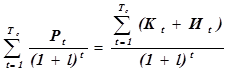 або: де Рt, Кt, Иt— відповідно виторг від продажу, капіталовкладення, поточні витрати у t -тому році ЖЦВ, грн; Тс - термін служби інновацій, інвестицій, роки. Варіант визнається ефективним, якщо lф>=lн, де lф і lн відповідно фактична та нормативна величина внутрішньої норми дохідності (ВНД), в.о. При порівнянні варіантів кращим визнається той, у якого величина l -максимальна. Перевагою вказаного показника у порівнянні з нормою прибутку є та обставина, коли вказана величина являє собою узагальнююче (середнє значення рентабельності) з урахуванням результатів та витрат заходу НТП, що аналізується, за час його використання та розподілених у часі. Тому вказаний показник знайшов широке застосування у міжнародній практиці. Найбільшою мірою він застосовується при наявності обмеженого капіталу, коли потрібно визначити найбільш вигідні напрями його застосування. Якщо інвестиції здійснюються у році t =0, а результати та витрати протягом терміну служби не змінюються, то визначення величини l спрощується. Після відповідних перетворень рівняння набирає вигляду: