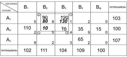Через заполненные клетки определяем потенциалы первого, второго, и третьего столбцов. Далее через клетку (A2,B3) определяем потенциал второй строки, через клетку (A2,B4) определяем потенциал четвертого столбца. После чего через клетку (A3,B4) определяем потенциал третей строки и через клетку (A3,Bф) потенциал последнего столбца. Проверяем условие оптимальности. Оно не выполнено в клетках (A1,B4), где нарушение составляет 4, (A1,Bф), где нарушение составляет 4, (A2,B1), где нарушение составляет 6, (A2,B2), где нарушение составляет 6, (A2,Bф), где нарушение составляет 7 и (A3,B2), в которой нарушение составляет 2. Применим формальное правило улучшение плана для клетки (A2,Bф), т.к. в ней выявлено наибольшее нарушение.