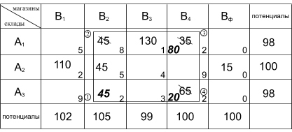 Проверяем условие Данцига: 7 = 5 + 3 – 1. Строим систему потенциалов. Задаем первой строке потенциал равный 100.