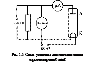 Температуру катода, яка входить у формулу (1.2), визначають на підставі розгляду теплової рівноваги ка-тода. Залежність температури вольфрамового катода від розсіюваної на ньому потужності розжарення наведено в табл. 1. На рис. 1.5 зображено схему установки для вивчення явищ тер-моелектронної емісії. Лампу ПМИ-2 увімкнено як діод (сітка лампи з’єднана з анодом). Головними характеристиками діода є анодна та емісійна.
