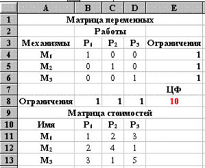 Рис. 37 Формулы целевой функции и ограничений находятся соответственно в ячейке E8 и ячейках E4:E6 (каждый механизм может быть назначен только на одну работу), B8:D8 (каждая работа выполняется только на одном механизме) (см. рис. 37 и 38). Вид электронной таблицы в режиме отображения формул представлен на рис. 38.