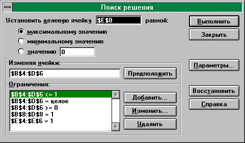 Рис. 39 Данная задача является задачей линейного булева программирования и в ней переменные xij должны принимать значения либо 0 либо 1. В поиске решения такое ограничение задается тремя ограничениями, по которым изменяемые ячейки в блоке (xij) одновременно больше либо равны 0, меньше либо равны 1 и являются целыми. Первые три записи в группе Ограничения (см. рис. 39) отражают этот факт. Результаты поиска решения приведены на рис. 37.