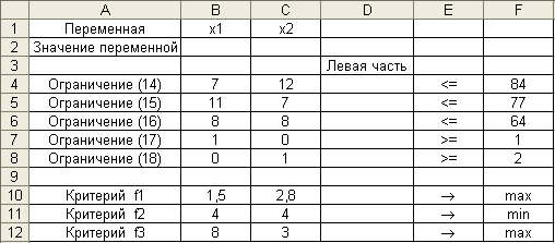 Рис. 1 Чтобы определить ограничения задачи и частные критерии оптимальности, в соответствующих ячейках требуется задать формулы, приведенные в таблице 1.