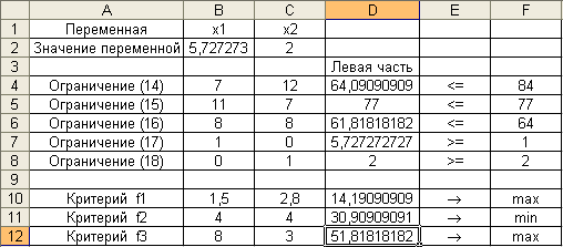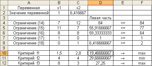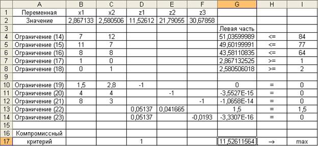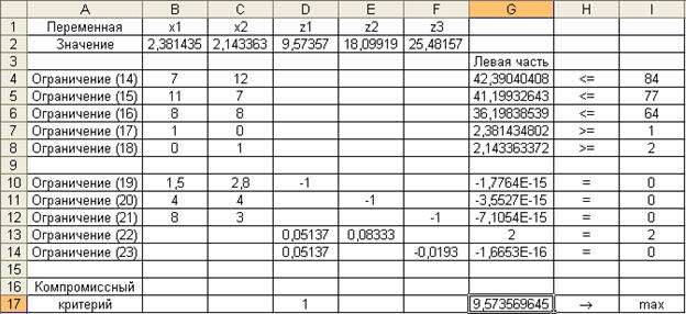 Для получения компромиссного решения задачи в диалоговом окне «Поиск решения » указывается адрес целевой ячейки G17, направление оптимизации (для критерия z 1 это максимальное значение), указываются ограничения и задаются параметры Линейная модель и Неотрицательные значения. Состояние ячеек электронной таблицы после выполнения поиска решения показано на рис. 6.