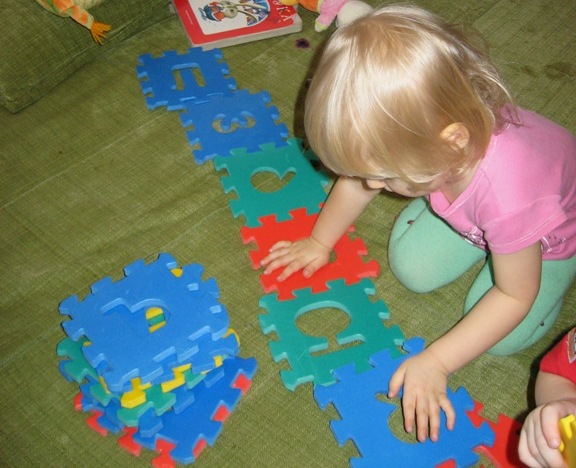 28.02.08 Играем на диване. Построила Марку из паззлов гараж для машины, Ксеня кричит: «И мне гараж надо…! Для зайчика!»