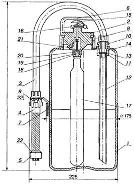 1 - корпус; 2 - головка; 3 - рукав; 4 - рукоятка; 5 - ороситель; 6 - ручка; 7 - скоба; 8 - прокладка; 9 - фильтр; 10 - штуцер; 11 - втулка; 12 - трубка сифонная; 13 - мембрана; 14 - прокладка; 15 - игла пусковая; 16 - чека предохранительная; 17 - баллон пусковой; 18 - мембрана: 19 - сухарь; 20 - втулка прижимная; 21 - штуцер; 22 – прокладка