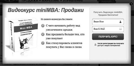 Примеры двухшаговых продаж Вы видели нашу рекламу в LiveJournal, которую мы разместили на странице Артемия Лебедева: http://tema.livejournal.com/1019401.html? Там мы прямо не рекламировали Инфоконференцию, хотя целью было – продать ее людям. Вместо этого мы рекламировали бесплатные книги, инфопродукты и тренинги. Артемия выбрали потому, что многие посетители его страницы являются нашей целевой аудиторией. Мы готовились к рекламной акции около двух месяцев: изучали рекламу в ЖЖ Лебедева – что сработало, а что нет; написали сообщение так, будто его сделал сам Артемий, в его стиле. После этого у нас на сайте зарегистрировались более 6000 человек. Многие пришли на Инфоконференцию, где купили другие наши тренинги и услуги. Был большой всплеск интереса, и мы его тут же монетизировали. Потраченные на рекламу деньги отбили. Но главное – пополнили клиентскую базу. Основная цель в модели двухшаговых продаж – получение контакта. Мы вкладываем деньги не ради мгновенной продажи, а чтобы получить возможность дальше отправлять новому человеку свои сообщения. Для визита и покупки всегда нужен повод. И зачастую он не является способом получить большие деньги. Вам нужна не только система правильной рекламы, но и система правильной работы с клиентами – существующими и потенциальными. А чтобы монетизировать новичка, требуется правильно выстроенная система продаж: разделение продуктов на дешевые и дорогие; upsell, cross‑sell и downsell; активный отдел продаж, который будет плодотворно работать по данной системе. Само по себе ничего не продается. Для этого нужно прилагать усилия. Сбор контактов Получив контакт клиента (номер телефона, почтовый или электронный адрес), в дальнейшем вы не будете вкладывать дополнительные средства в отправку рекламного предложения. У вас появится возможность обращаться с ним напрямую и предлагать свои продукты. Получение контактов – отдельный вопрос. Их можно получать бесплатно или в обмен на что‑то, например скидку или бесплатный продукт. Вот как это делаем мы (рис. 1).