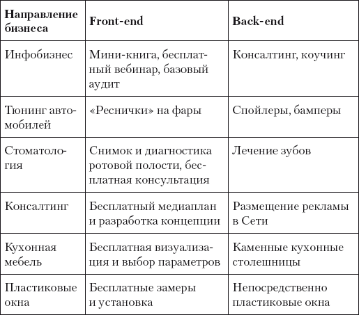 Без этого приема реклама в лоб работает плохо. Особенно на рынках с высокой конкуренцией. Примеры распределения продуктов на front‑end и back‑end.