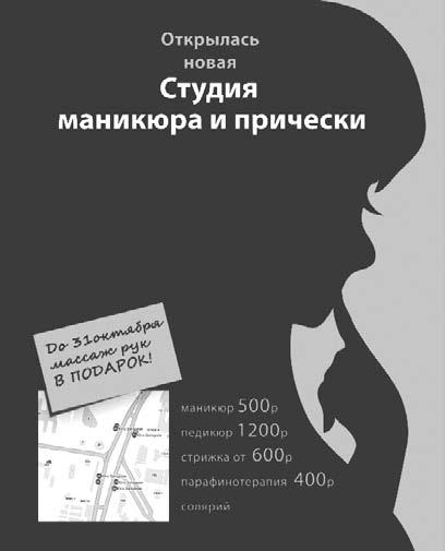 Рис. 34 Реклама студии маникюра и прически: «До 31 октября массаж рук в подарок». Здесь присутствуют бонус и дедлайн плюс хорошая схема проезда (рис. 36).