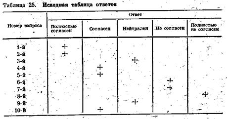 В 1932 г. Лайкерт предложил метод измерения установки без использования экспертной оценки, который получил название шкалы Лайкерта10. Идея довольно проста: группе лиц даются вопросы, которые должны оцениваться по пятибалльной системе в отношении согласия с этими вопросами (суждениями): 5 —«полностью согласен» 4—«согласен» 3 — «нейтрален» 2—«не согласен» 1—«полностью не согласен» Баллы одного лица относительно всех вопросов суммируются. Полученная сумма — балл этого лица. Затем лица ранжируются по баллам. Для построения шкалы отбирается большое число утверждений, относящихся к исследуемой установке. Главная заслуга Лайкерта состоит в том, что он предложил критерий внутренней состоятельности вопросов, который позволяет вбрасывать вопросы, не вписывающиеся в программу исследования. Определяется корреляция между баллами вопроса и общим баллом данного лица. Это можно проиллюстрировать следующим примером. 10 лицам (А, Б, В и т. д.) дается 10 вопросов, которые они должны оценить по пятибалльной системе. Каждому лицу дается бланк (табл. 25), Индивид делает отметку по каждому вопросу в соответствии о своим отношением к нему. Далее подсчитывается общий балл лица относительно всех вопросов. Полученные данные сводятся в следующую таблицу (здесь даны вычисления для пятого вопроса):