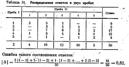 Здесь х1 и х11 — ответы по анализируемому вопросу L - го респондента в I и II пробах соответственно. Пример. Пусть ответы на вопрос в пятибальной шкале для выборки 50 человек распределились, как в табл. 31. Таким образом, в I пробе оценку «1» дали 9 респондентов, из них только трое повторили ее в пробе II, пятеро отметили «2», один дал оценку «3» и т. д.