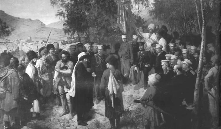 Горшельт. Представление плененного Шамиля князю А.И. Барятинскому 25 августа 1859 г. под Ведено. А то, что затем произошло, не укладывалось ни в какие прежние представления имама о многолетнем противнике. Завидев ожидавшего его Барятинского, Шамиль готов был услышать в ответ на предыдущий отказ от капитуляции: «А что, донгуз (свинья), где твоя шашка, которую ты предлагал мне взять самому?» – и тут же заколоть себя, тем избегая позора. Но к великому изумлению ему были оказаны почести, подобающие главе государства, пусть и побежденного. А с Барятинским его потом надолго связала личная дружба. О завершении войны наместник на Кавказе объявил лаконичным приказом 22 августа 1859 г.: «Воины Кавказа! В день моего приезда в край я призывал вас к стяжанию великой славы Государю, и вы исполнили надежду мою… Шамиль взят – поздравляю Кавказскую армию» [16]. Александр II по достоинству наградил полководца: к ордену Св. Георгия 2‑й степени за успехи в Дагестане добавились орден Св. Андрея Первозванного за Гуниб, назначение шефом Кабардинского полка и, наконец, производство в генерал‑фельдмаршалы. Войска встретили эту новость ликованием, не без оснований считая ее «наградой всему Кавказу». За тот короткий срок, в течение которого расстроенное здоровье еще позволило Барятинскому заниматься военно‑административными и хозяйственными преобразованиями края, им было сделано немало. Из бывших Черноморского и Линейного казачьих войск были образованы Кубанское и Терское войска, сформированы Дагестанский конно‑иррегулярный полк и Дагестанская постоянная милиция. На Кубани заложен ряд новых укреплений и станиц, открыты Сухумская и Константиновская морские станции, учреждены военные училища. На карте империи появилась Бакинская губерния. Планов строилось еще больше, но уже в 1862 г. Барятинский вынужден был просить государя об отставке по болезни. Сохранив за собой членство в Государственном совете, Александр Иванович жил потом у себя в имении в Варшавской губернии и оставался как бы в тени. Появляться на людях заставляла его только очередная опасность для России извне. Так, накануне русско‑турецкой войны 1877–1878 гг. возникла мысль о назначении его главнокомандующим. Она, правда, не была реализована. Но с окончанием войны, будучи недовольным решениями Берлинского конгресса, унижавшими Россию, фельдмаршал уже сам предложил свои услуги в предвидении возможных международных осложнений. С его участием в Петербурге даже обсуждался план предполагаемых военных действий. Нельзя умолчать еще об одной странице в биографии князя. Когда в 60‑е годы под руководством военного министра Д.А. Милютина, его бывшего подчиненного, развернулись военные реформы, Александр Иванович выступил резким противником (см. очерк о Д.А. Милютине). Военачальники разошлись во взглядах на пути реформирования: А.И. Барятинский считал наиболее подходящим прусский вариант, при котором руководство армии формально принадлежало императору, а фактически – начальнику Генштаба. Однако национальная традиция, испытанная десятилетиями, ратовала за концентрацию всей полноты управления военной организацией государства в руках военного министра. И последующая история подтвердила правоту Милютина. Земной путь Барятинского пресекся в марте 1879 г. Три дня по указу императора российская армия нос
