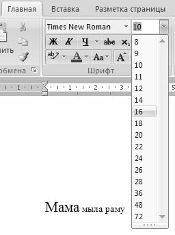 Структура таблицы (количество строк и столбцов) указывается мышью в подменю, открываемом при нажатии кнопки Таблица на вкладке Вставка. На рис. 1.2 видно, что при данном представлении будет нарисована таблица с пятью столбцами и тремя строками; ниже показано, как будет выглядеть таблица в документе. Если отказаться от создания таблицы, то ее изображение исчезнет. Таким образом, можно быстро выбрать наиболее подходящий вариант создания таблицы. Аналогичным образом можно заранее увидеть, как будет выглядеть слово или текстовый фрагмент, если применить к нему тот или иной стиль (шрифт, размер шрифта, и т. д.). На рис. 1.3 показан фрагмент текста, для первого слова которого «примеряется» шрифт размера 16.