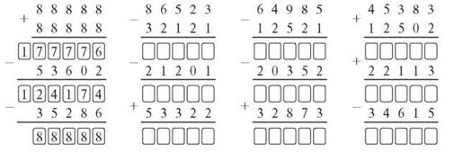 3) Робота за картками. Обчислити приклади. У числовій колоні останнє число повинно збігатися з першим.