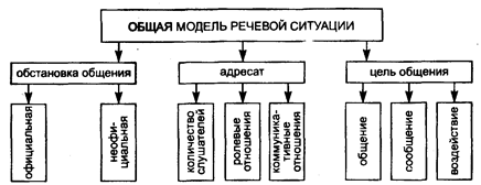 Понятие "речевая ситуация" является базовым понятием лингвопрагматики — науки, изучающей, как человек использует язык для воздействия на адресата (воспринимающего речь) и как ведет себя в процессе речевого общения. От чего зависят особенности речи я речевого поведения человека? Как оказалось, от многих причин и факторов. Совокупность этих факторов и называется речевой ситуацией. Основными компонентами ее являются внешние и внутренние условия общения, участники общения, их отношения. Общую схему речевой ситуации можно представить следующим образом.