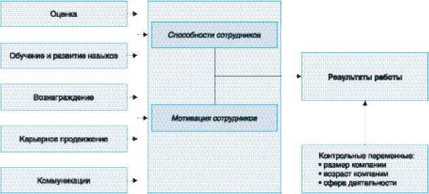 Рис.2.1. Концептуальная модель влияния методов управления человеческими ресурсами на результаты деятельности фирм необходимыми для данной работы компетенциями[43] Полученные результаты представляют научный интерес, поскольку впервые проверено эмпирически влияние методов управления человеческими ресурсами на деятельность фирм на основе российских данных. Результаты исследования убедительно продемонстрировали существование положительных взаимоотношений между методами управления человеческими ресурсами и результатами деятельности российских фирм. Эти результаты в значительной степени согласуются с данными, полученными ведущими в этой области исследователями в работах, проведенных в других географических контекстах. В то же время они позволили выявить специфические особенности, проявляющиеся именно в российских условиях. Например, высокая гетерогенность рынка труда в России по сравнению с другими странами повышает актуальность работы над процедурой отбора сотрудников при найме на работу. Кроме того, обычно российские сотрудники имеют высокий уровень образования, однако не в той области, в которой они работают, что делает программы по обучению и развитию специфических навыков наиболее эффективными. Практическое значение исследования заключается в возможности использования результатов для российских фирм при проведении консультационных проектов в сфере управления человеческими ресурсами. Технология сопоставительного анализа конкурентов, нацеленная на поиск наилучшего опыта (или, одним словом, бенчмаркинг), делает полученные результаты необходимым инструментом в условиях конкуренции.[44]