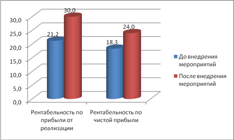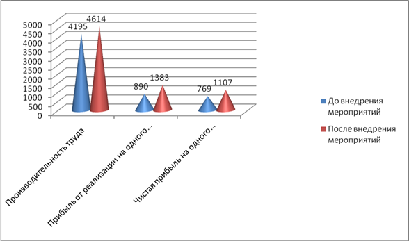 Данные таблицы 2.17 позволяют сделать вывод о том, что в результате внедрения мероприятий произойдут следующие изменения показателей: - рост рентабельности по прибыли от реализации на 8,8 % - рост рентабельности по чистой прибыли на 5,7% - рост производительности труда на 419 т.р. на чел. - рост прибыли от реализации на одного работника на 494 т.р.на чел. - рост чистой прибыли на одного работника на 338 т.р. на чел. Таким образом, можно сделать вывод о том, что внедрение мероприятий для ЗАО «Ремонт-Сервис» будет эффективным, так как все показатели по мероприятиям обеспечивают прирост в 2013 году.