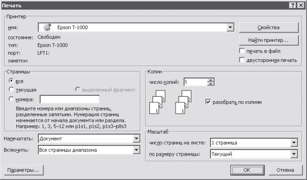 Для распечатки документа в меню Office предназначены команды подменю Печать: Печать, Быстрая печать и Предварительный просмотр. При выполнении команды Печать открывается окно, изображенное на рис. 2.9. В области Принтер указывается название выводного устройства и отображаются некоторые его характеристики. Для изменения настроек следует воспользоваться кнопкой Свойства. Чтобы печать осуществлялась на обеих сторонах листа, установите флажок двусторонняя печать. В области настроек Страницы определяется текст, который требуется напечатать. Если необходимо распечатать целый документ, то следует установить переключатель в положение все. Если же он в положении текущая, то будет выведена та страница документа, в которой находится курсор. При необходимости выборочной печати нужно установить переключатель в положение номера и в находящемся правее поле ввести номера определенных страниц. Режим выделенный фрагмент используется для вывода произвольного участка текста (его следует предварительно выделить).