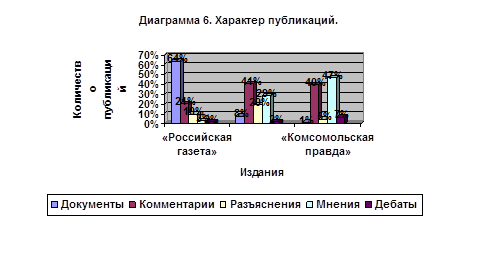 Основной задачей данной исследовательской работы является анализ ведущих российских изданий с целью определения объективности и полноты освещения деятельности законодательной власти Российской Федерации. Для анализа мы взяли три ведущих российских печатных издания разного формата, а именно: "Российскую газету" как представителя "официальной" прессы, "Известия" - "качественной", и "Комсомольскую правду" - представителя "массовой" прессы. Дадим краткую характеристику этих изданий. " Российская газета" - ежедневная общественно-политическая общенациональная газета новой России. Учредитель - Правительство Российской Федерации. Газета издается с 11 ноября 1990 года, выходит на 8-16 полосах формата А2. Тираж 431569 экземпляров. "Российская газета" имеет статус официального публикатора государственных документов. Законодательные акты РФ вступают в силу после публикации в "Российской газете" (Официальным опубликованием Федерального Конституционного закона, Федерального закона, акта палаты Федерального Собрания считается первая публикация его полного текста в "Российской газете". [55]). "Российская газета" публикует качественную разностороннюю информацию для широкого круга читателей, профессиональные аналитические материалы и комментарии, тематические обзоры, текущие события в стране и за рубежом, новости политики, экономики, общественной жизни, науки, культуры, спорта." Успешно справляясь с задачами рупора правительства, газета остается востребованной у всех политически активных и неравнодушных"[56]. Газета распространяется на всей территории Российской Федерации. У "Российской газеты" - 14 региональных представительств, газета печатается в 32 городах России и СНГ и имеет 38 корпунктов в стране и за рубежом. Генеральный директор: Горбенко Александр Николаевич Главный редактор: Фронин Владислав Александрович Адрес редакции: 125881, Москва, ул. Правды, 24 URL: www.rg.ru Вообще, роль "Российской газеты" особая: на нее, как на официальное издание, ложится особая ответственность за то, чтобы доносить до населения, причем последовательно, ясно, и всесторонне позицию государства. С помощью "Российской газеты" государство должно объяснять суть и необходимость новых законопроектов, возможные последствия их реализации для разных групп населения. Это как бы дополнительная, особая функция официального издания. И если "Российская газета" претендует на роль серьезного качественного издания, то в ней, конечно же, должны быть разные точки зрения, серьезный объективный анализ, мнения экспертов. Посмотрим, так ли это на самом деле? " Известия" - Ежедневная общественно-политическая газета. Выходит с марта 1917 года. Периодичность - 6 раз в неделю, кроме воскресенья, тираж 263.650 экз. Ежемесячное приложение "Закон", и выходящие с разной периодичностью тематические вкладки: "Туризм", "Страхование", "Недвижимость", "Банки" и др. Адрес редакции: 127994, г. Москва, ул. Тверская, д.18, корп.1. Главный редактор: Владимир Мамонтов. URL: www.izvestia.ru " Комсомольская правда" -общенациональная ежедневная газета. Выходит с мая 1925 г. Самый большой тираж в России и СНГ 27 млн. экз.2 000 000 читателей ежедневно. Главный редактор, генеральный директор: Сунгоркин В. Н. Адрес редакции: 125866, Москва, улица Правды, 24 URL: www.kp.ru Газета "Известия" в освещении проблем во многом сходна с "Российской газетой", но между этими издан
